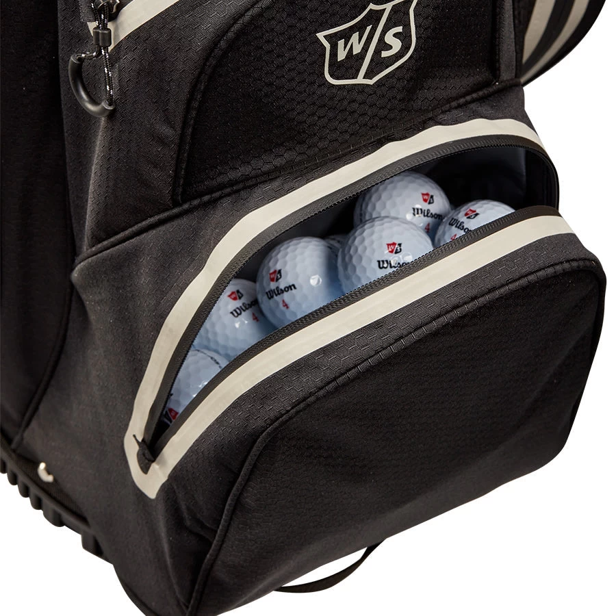 Compact storage, organized pockets and a sturdy base keep your clubs at the ready on the course. The Wilson Staff EXO Dry Golf Stand Bag is a premium golf bag with innovative features like 5 divided club sections, a non-skid base, 3D foam padded straps, a DryTech valuables pocket, large garment pocket and a large ball pocket.